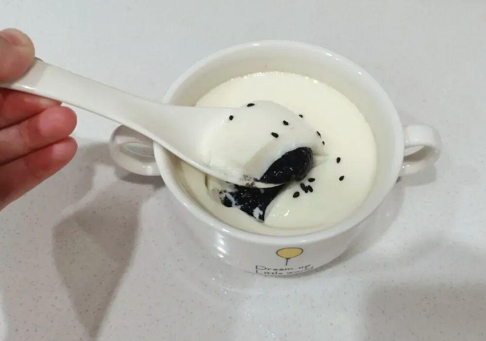 做好的黑芝麻糊燉奶,蛋奶層光滑白嫩,一勺下去黑白分明,黑芝麻香味撲鼻而來。