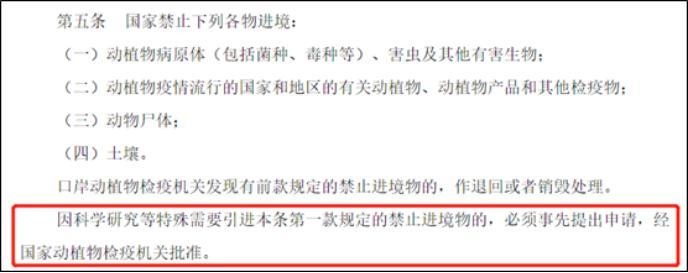《中華人民共和國進出境動植物檢疫法》的第五條中,明確提到了因科學研究等特殊需要引進本條第一款規定的禁止進境物的,必須事先提出申請,經國家動植物檢疫機關批准。