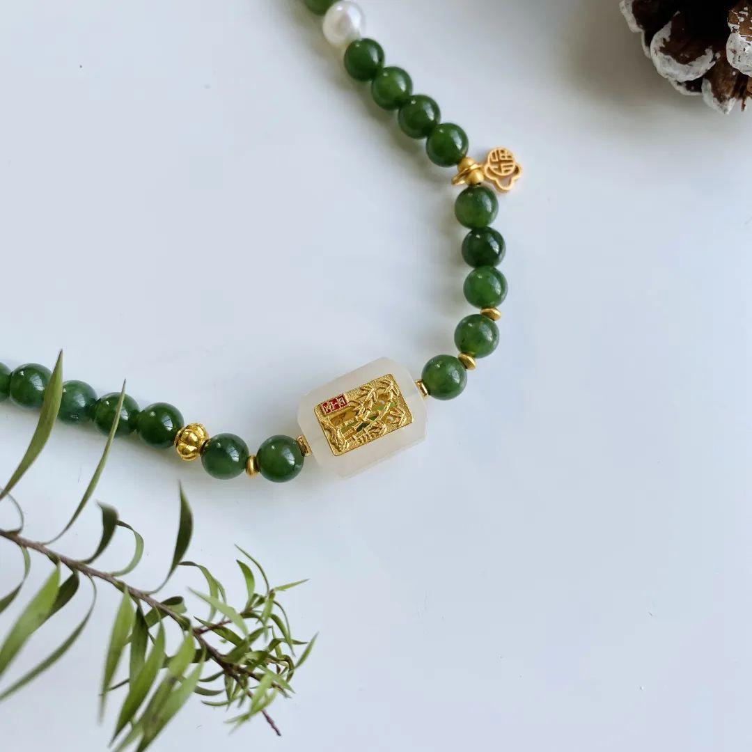 本款選用鬱鬱蔥蔥的碧玉,搭配白玉雕刻玉牌,古樸雅緻;