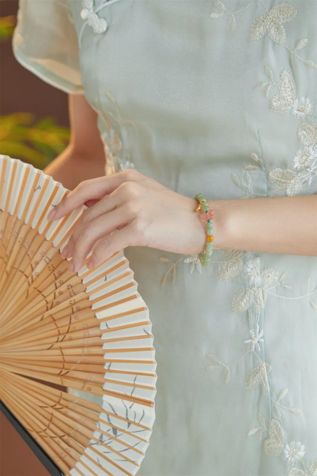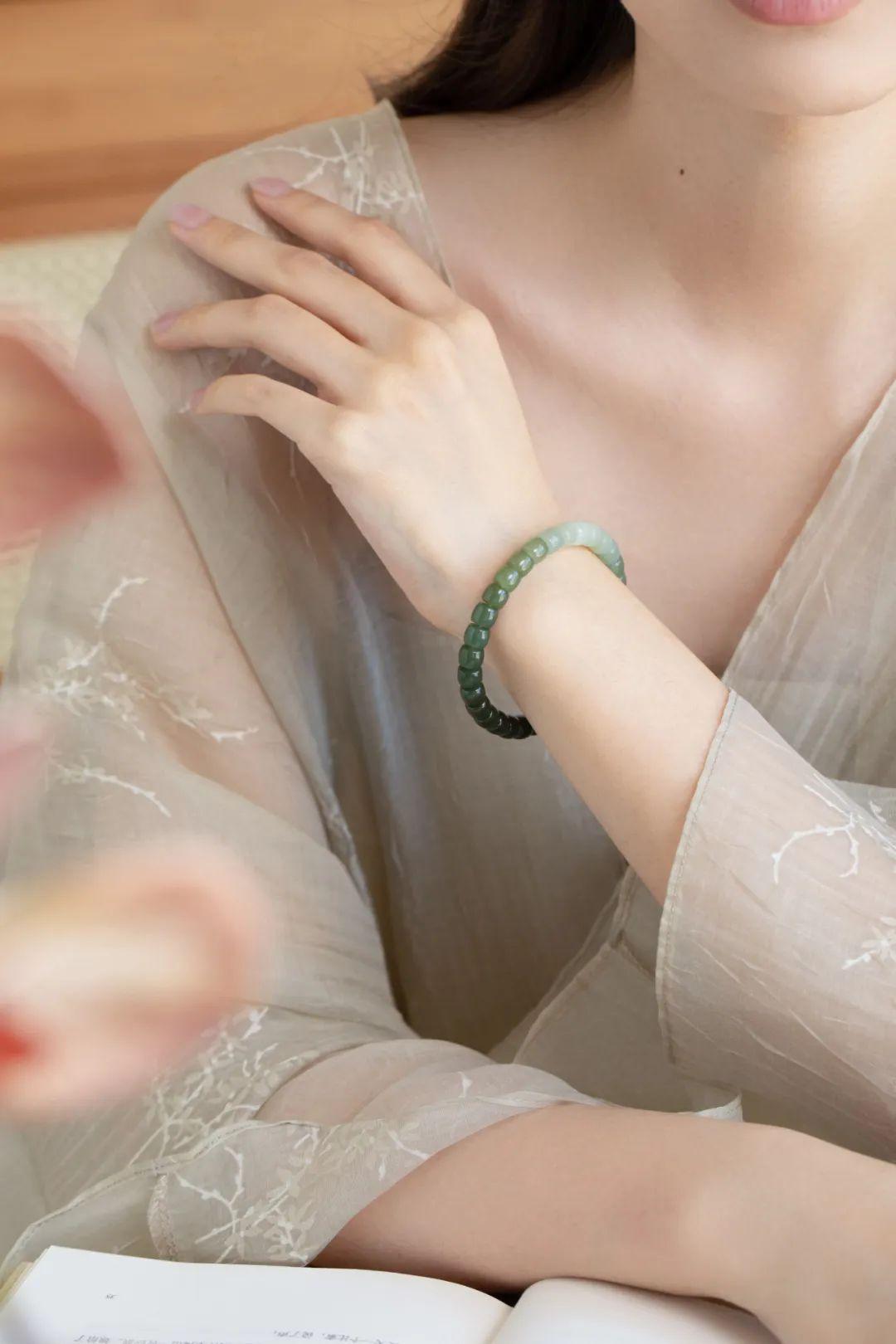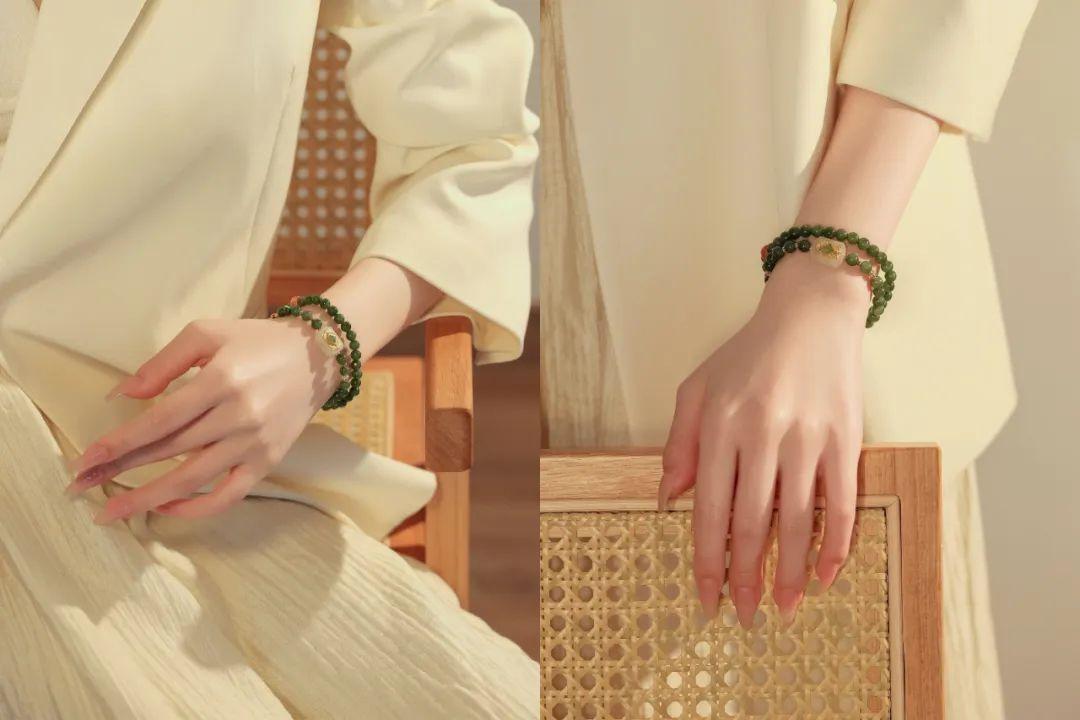 這款手串以和田玉中常見的青色爲設計靈感,將不同的青色逐一穿製成串有層次美的“漸變手串”,詮釋新中式的優雅。也是晴水玉系列的經典款。