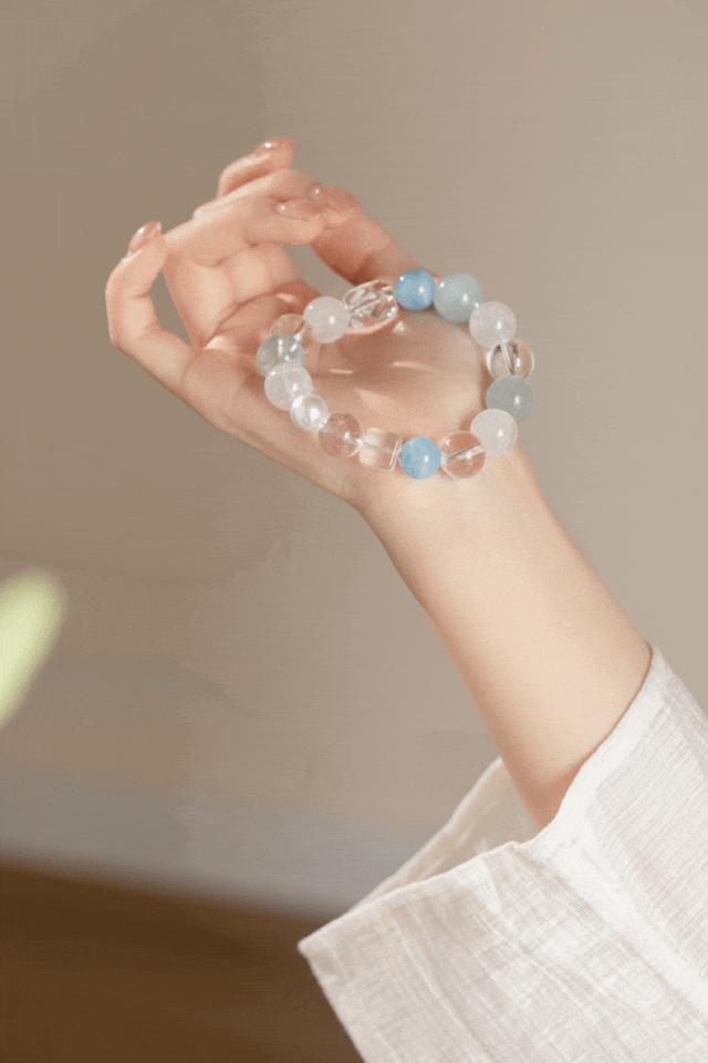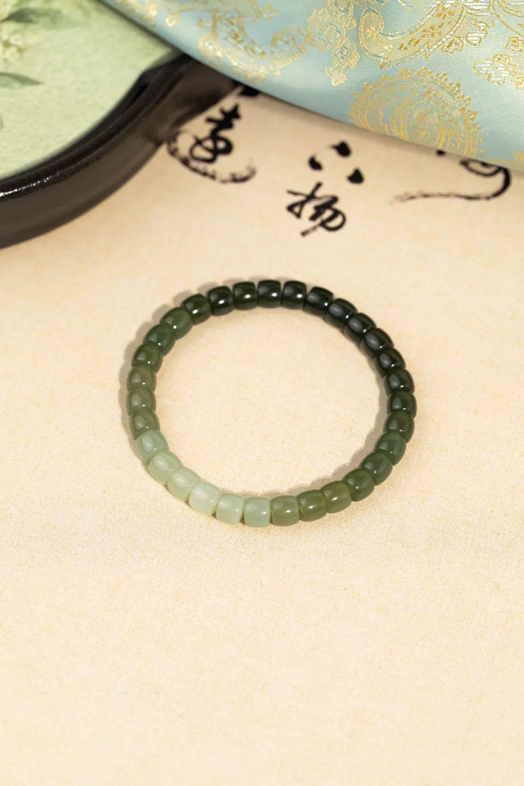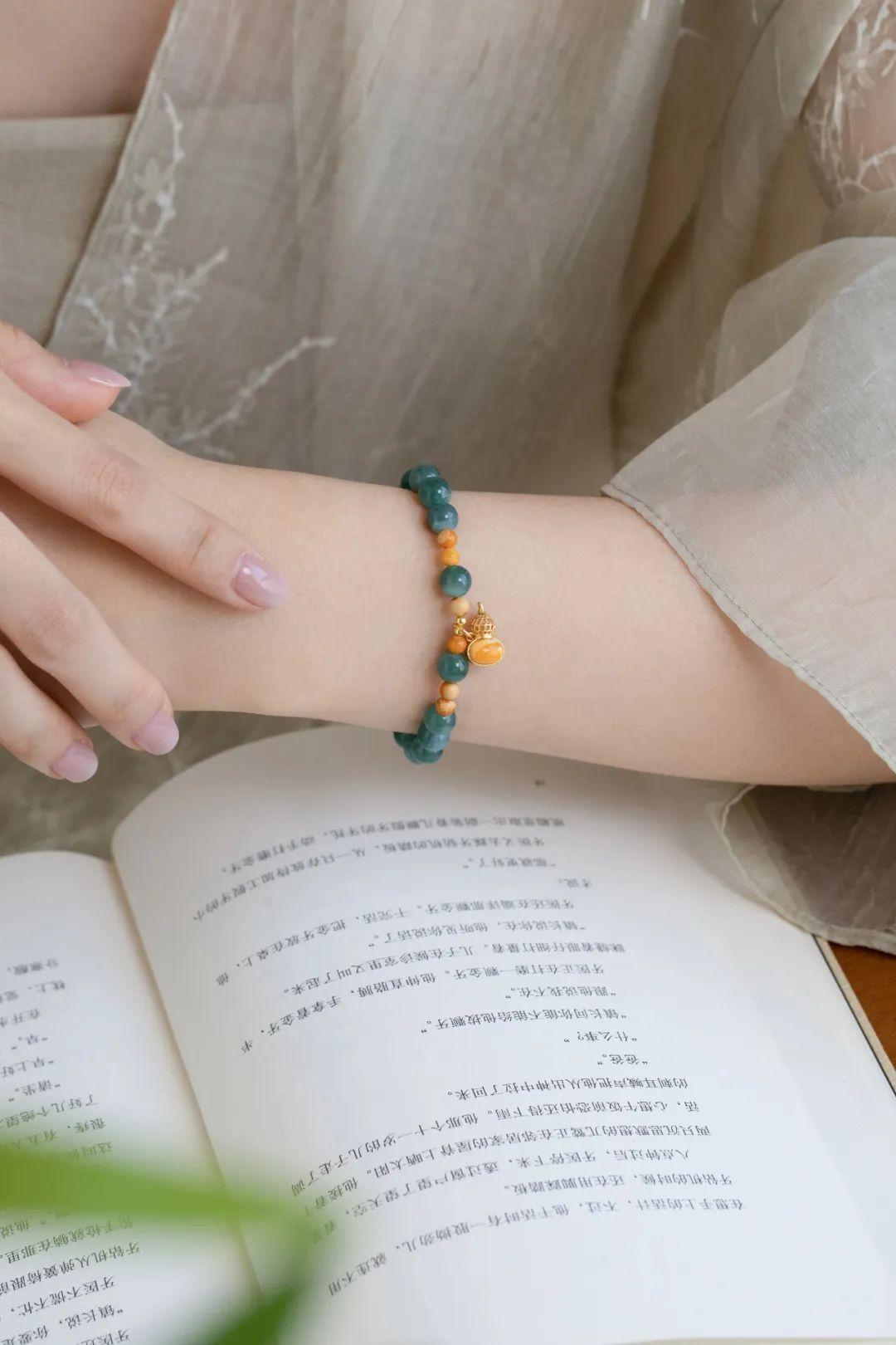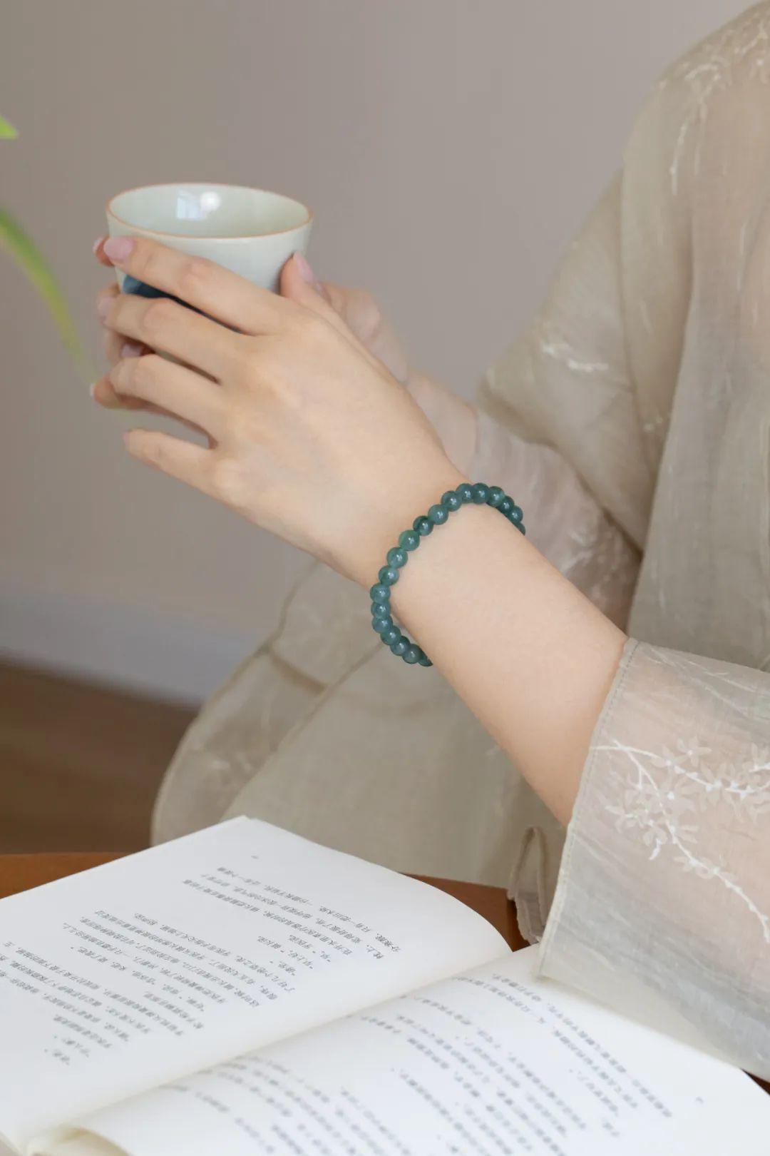 這款手串以和田玉中常見的青色爲設計靈感,將不同的青色逐一穿製成串有層次美的“漸變手串”,詮釋新中式的優雅。也是晴水玉系列的經典款。