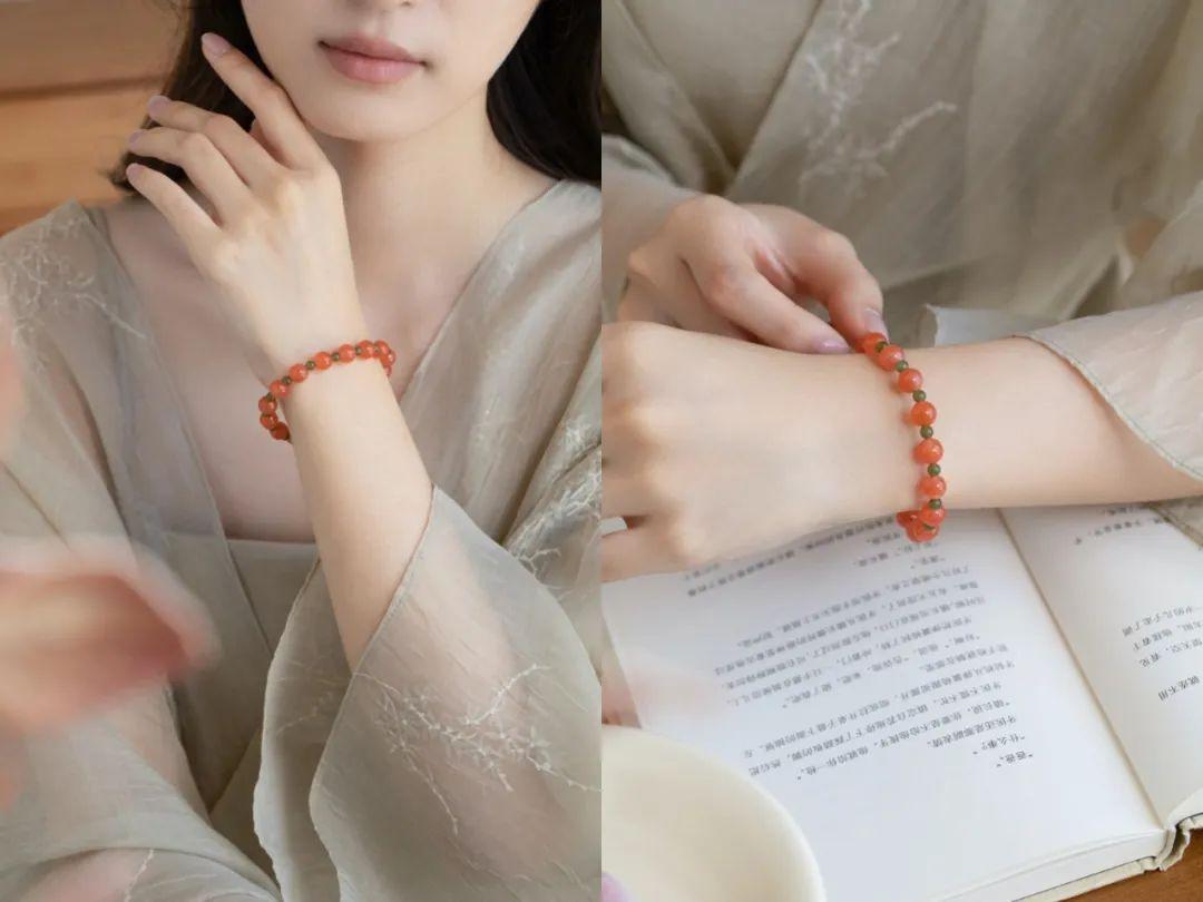紅潤透亮的冰飄南紅搭配翠色的小米珠碧玉,是今年非常流行的搭配,櫻紅點翠間透露着蓬勃向上的生命力感。