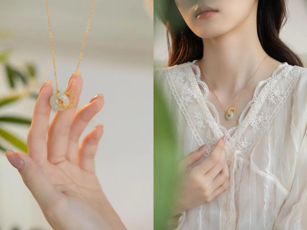 取料粉青和田玉,搭配銀鍍古法金的復古工藝,精緻時尚的設計,讓和田玉剛好融入到我們的日常穿搭裏。