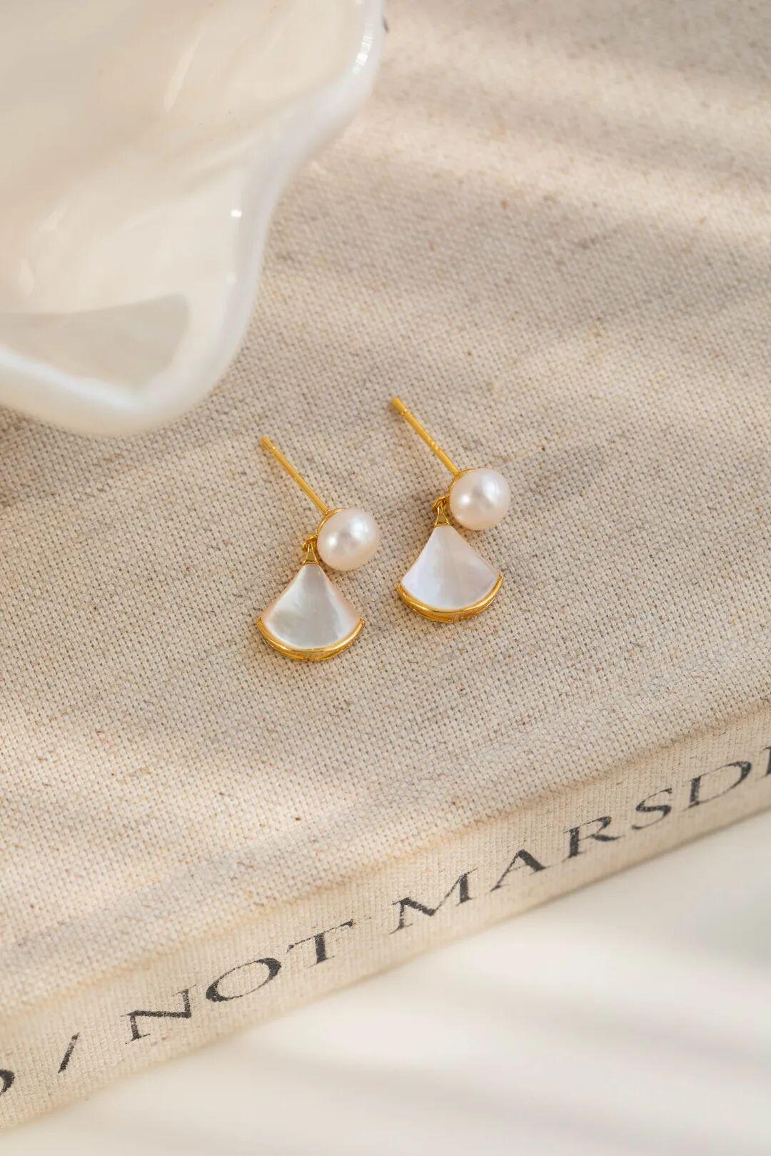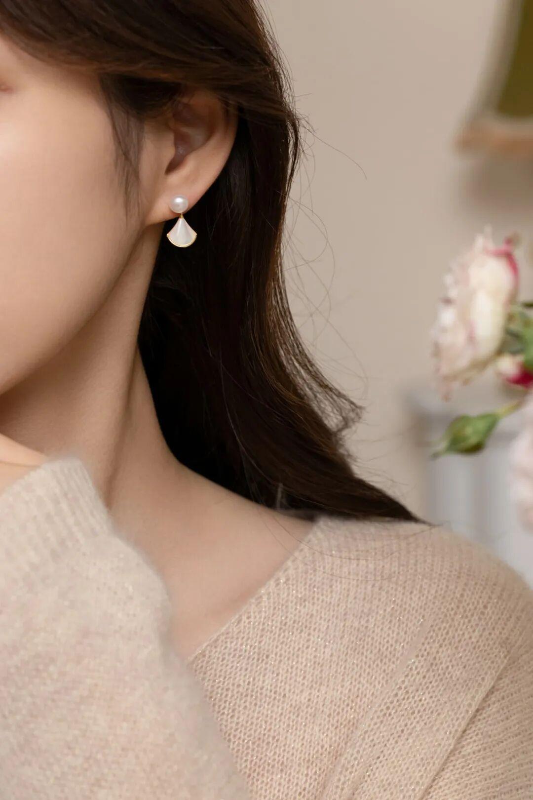 經典不挑人的一個款式,扇形小裙襬選用深海白蝶貝貝母鑲嵌,14K金包邊,光彩如月光自然動人。