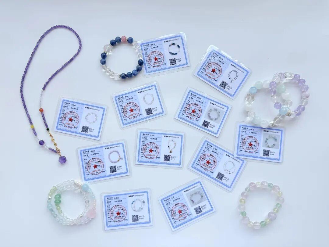 珍珠均爲天然珍珠,不可避免存在些許瑕疵。翡翠產地爲危地馬拉。爲了美觀和產品穩定性,部分海藍寶和瑪瑙經過優化處理。硃砂手串爲再造辰砂非原礦。