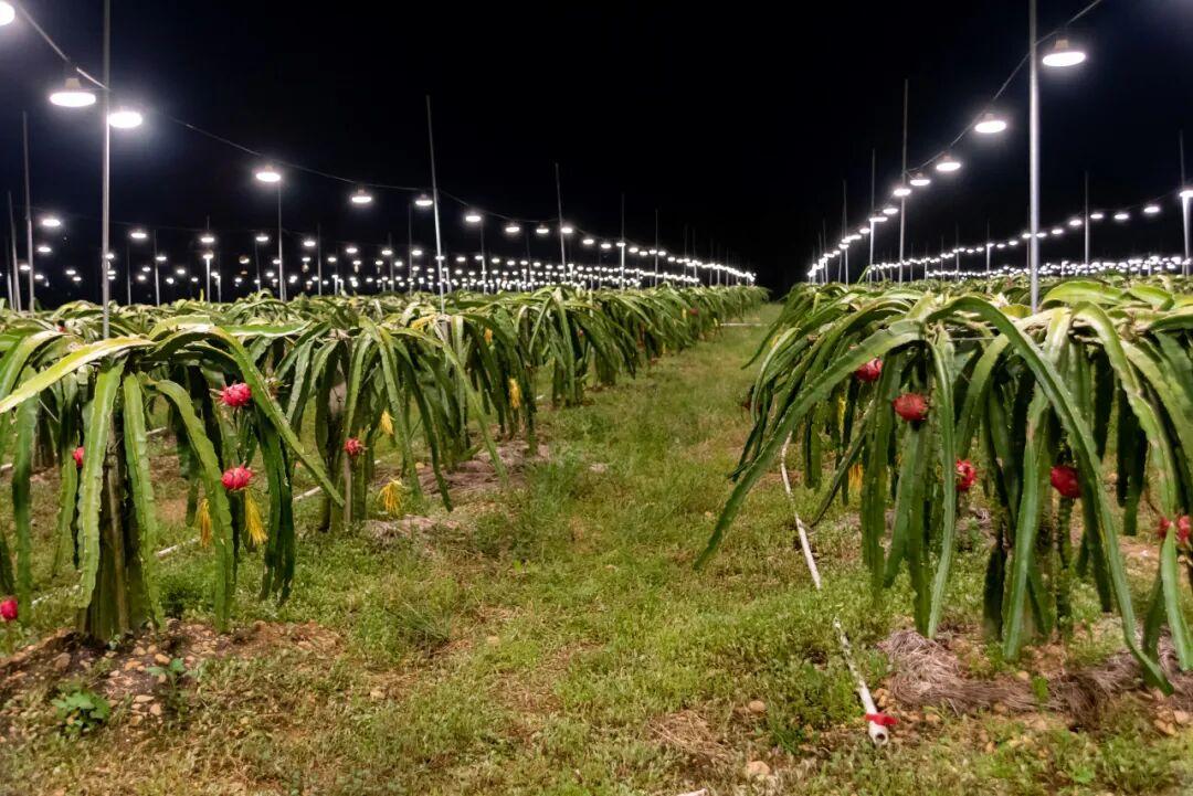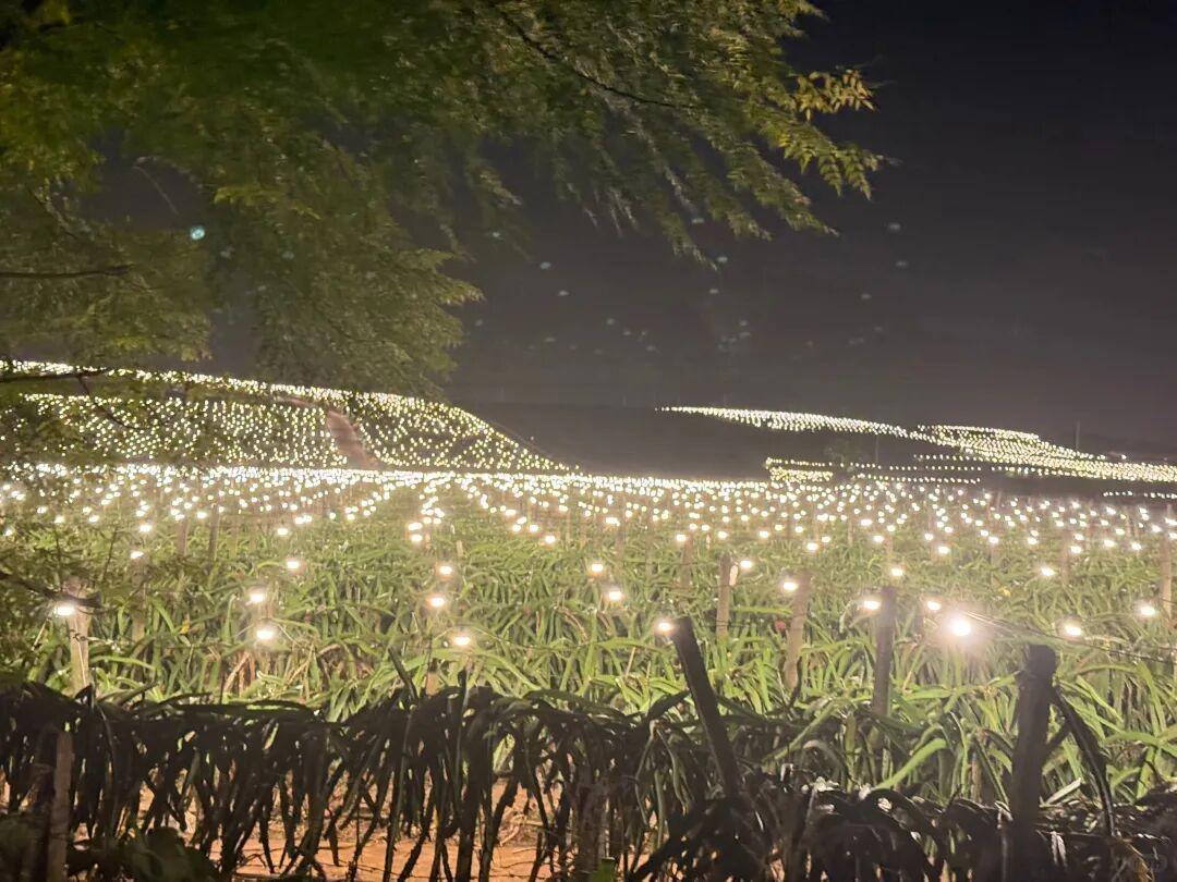 火龍果種植園定期開始上演的大型燈光秀,是爲了讓火龍果不睡覺,促進生產,從而讓我們能在更多時段喫到美味營養的火龍果。別人是給點陽光就燦爛,火龍果咋這麼好騙,給點燈光就行?