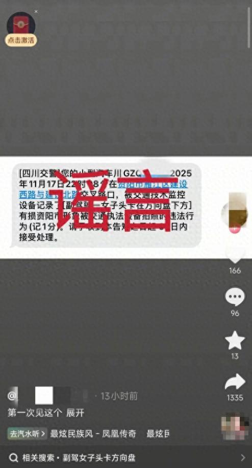 11月19日,童某在抖音平臺發佈的截圖顯示,小型汽車川GXX於2025年11月17日22時08分在資陽市雁江區建設西路與建設北路交叉路口,被交通技術監控設備記錄了【副駕駛一女子頭卡在方向盤下方】有損資陽市形象被交通執法設備拍照的違法行爲(記1分)。