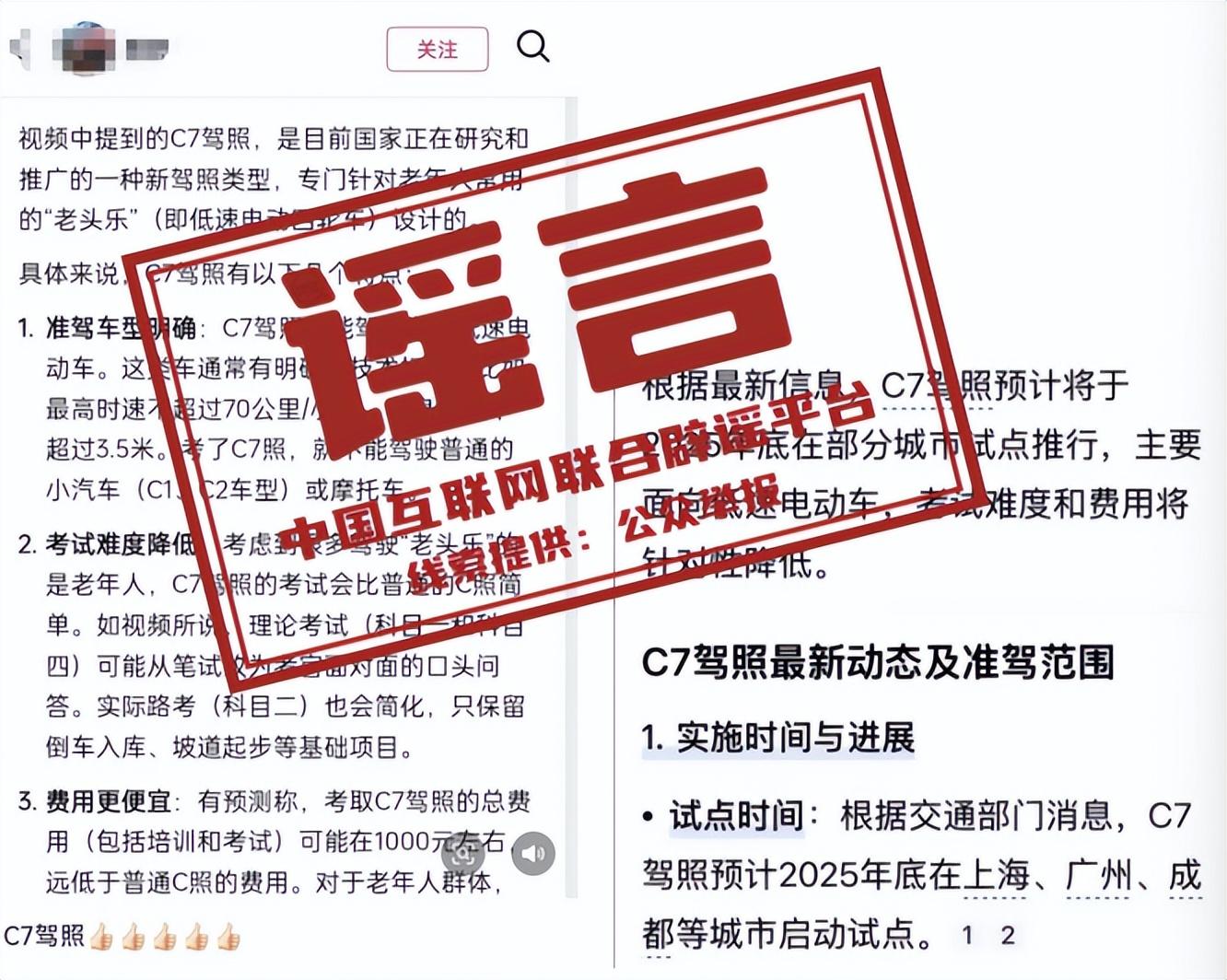 詳情:近日,網上流傳關於上海、廣州、成都等地試點“C7駕照”用於“老頭樂”(四輪低速電動車)的消息,聲稱“2026年初將全國推廣C7駕照,屆時‘老頭樂’需持證上路”“C7 駕照考試極爲簡單”,甚至編造“C7駕照科目一考口試”等考試細節。據中央廣播電視總檯中國之聲《新聞晚高峯》報道,相關城市公安交管部門予以明確否認,所謂“上海、廣州等地試點‘老頭樂’C7駕照”不實。相關信息多由四輪低速電動車行業的營銷號發佈,目前沒有設立“C7駕照”,C類駕駛證僅涵蓋C1-C6車型,有關營銷號發佈的內容爲虛假宣傳。