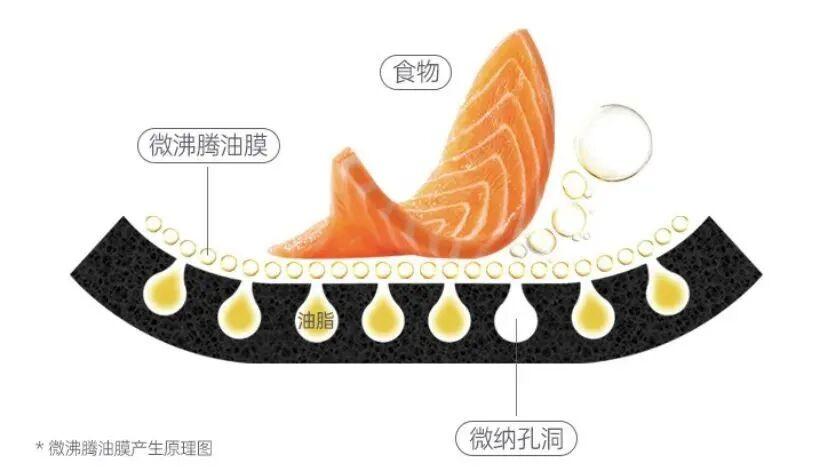 這就得講到它的獨特設計,品牌歷時7年,5萬次炒菜實驗研發,在炒鍋表面做了微納孔洞,烹飪時在鍋體和食物之間會形成微沸騰油膜,所以不粘不生鏽。