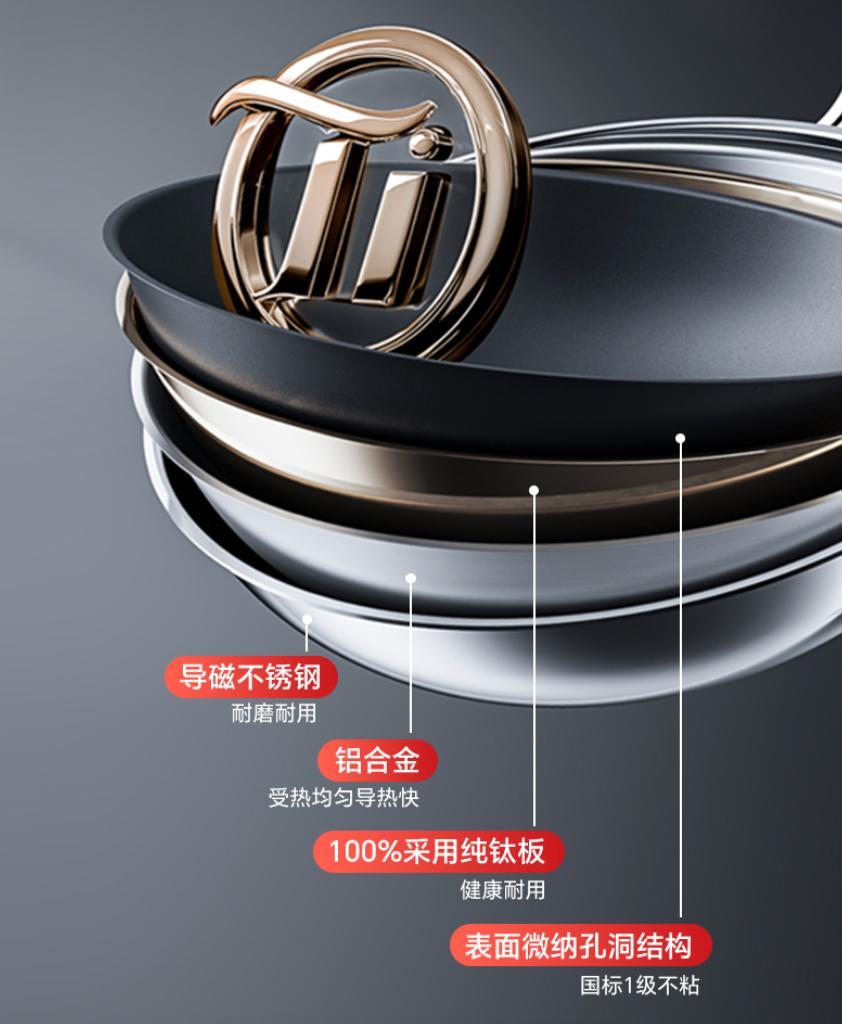 這個系列的 鍋用的都是“鈦鐵合金”複合材料,具有強度高、生物安全性、易清潔性、抗菌性和輕量化的特點。