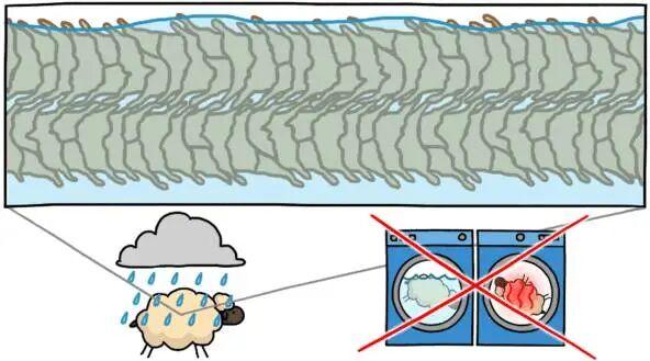 當一件羊毛衣被丟進洗衣機翻來滾去,這種單方向的摩擦阻力就會出現。羊毛纖維彼此摩擦的時候,鱗片就好像一個個小棘輪,只允許纖維往一個方向運動: