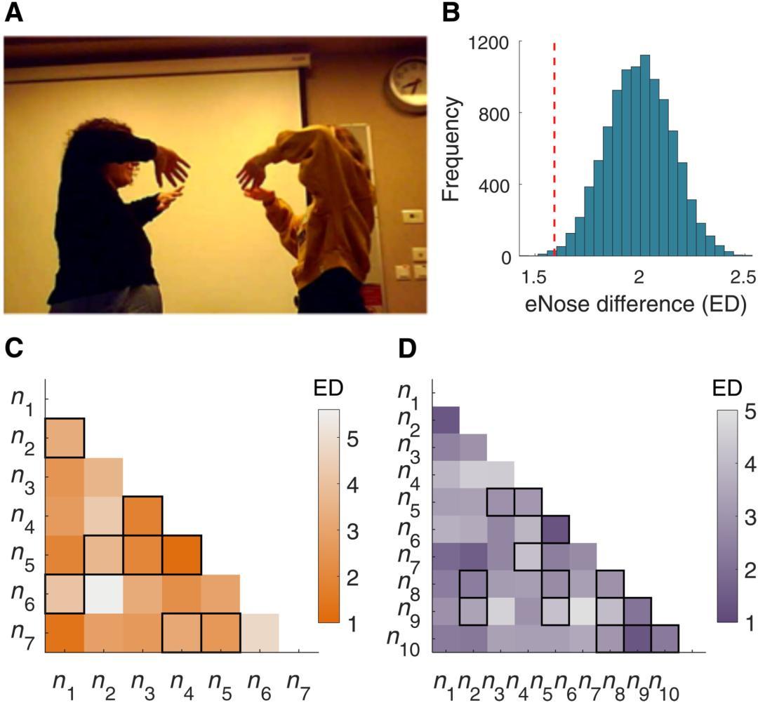 然後使用電子鼻(eNose) 進行體味化學成分分析,並計算體味相似度,同時找來志願者嗅聞上面 20 對朋友的氣味以及干擾氣味並進行打分時。結果發現,無論是電子鼻還是人類的鼻子,都能認爲好朋友之間的氣味更相似。