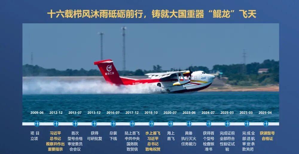 2025 年 4 月 20 日,AG600 正式獲得型號合格證,標誌着它具備全面投入實戰的能力。這是世界唯一一款同時滿足海上救援與森林滅火雙重任務的大型水陸兩棲飛機。