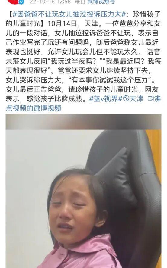 比如,不久前天津有一位爸爸,記錄下女兒哭訴大人不讓玩、自己壓力大的視頻併發布到網上,也引發了熱議。