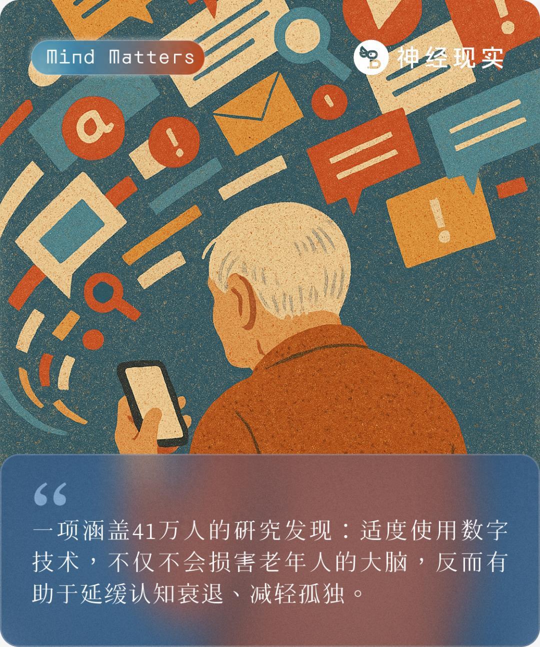 不過,文章也特別提醒,儘管數據顯示使用數字技術與認知健康整體呈正相關,但技術對老年大腦的影響並非簡單的“非黑即白”。關鍵在於“怎麼用”和“用多久”。研究認爲老年人上網與認知健康之間存在一種“U型關系”——適度使用與更好的認知表現相關,而過度使用則可能適得其反。此外,研究關注的對象主要是“數字先驅”一代,也就是在成年後才接觸電腦和互聯網的中老年人。而對從小就成長在數字環境中的新一代,技術帶來的長期影響是否依然如此,仍有待觀察。