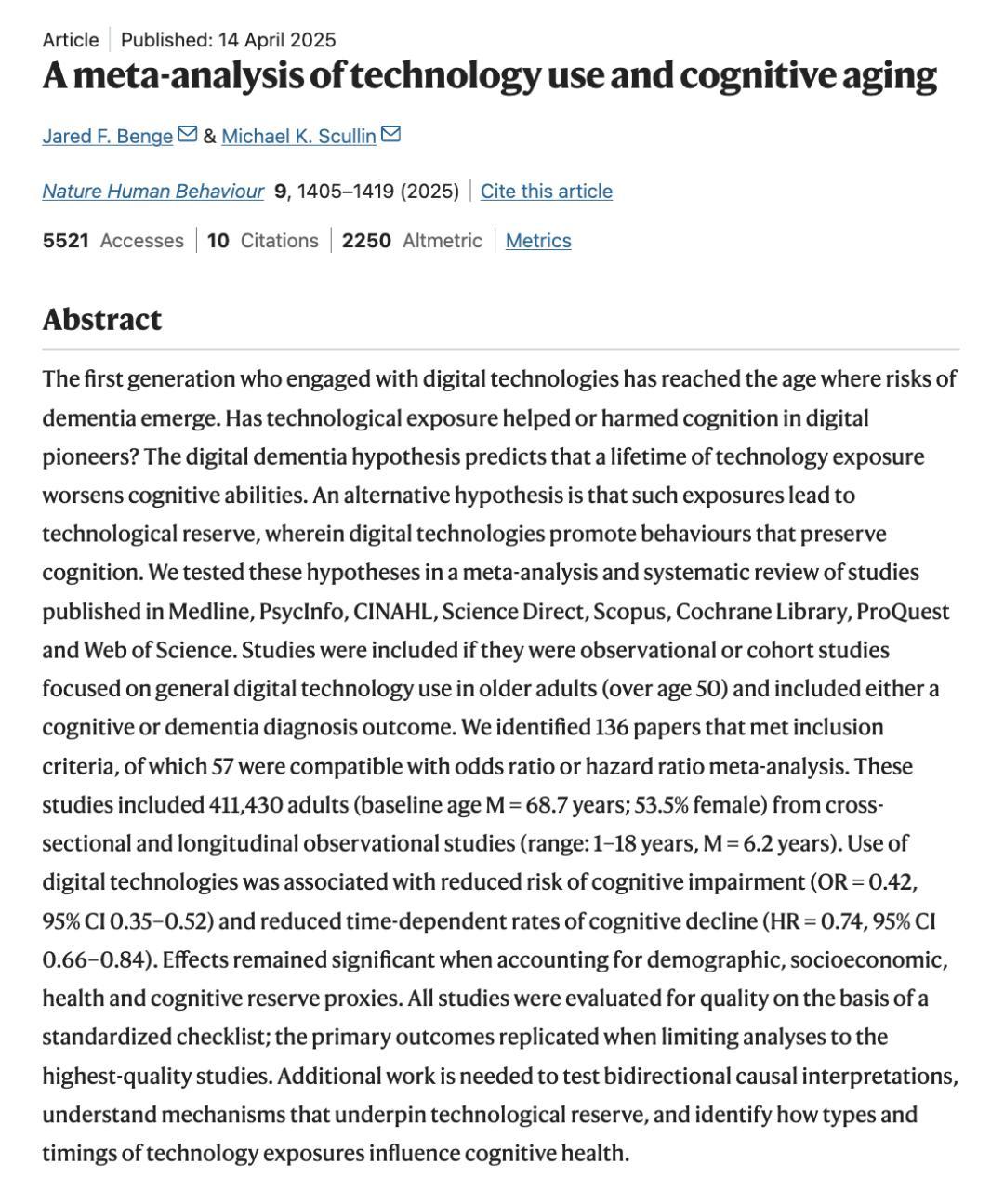 [1] Benge, J.F., Scullin, M.K. A meta-analysis of technology use and cognitive aging. Nat Hum Behav 9, 1405–1419 (2025). https://doi.org/10.1038/s41562-025-02159-9