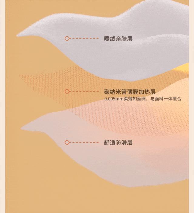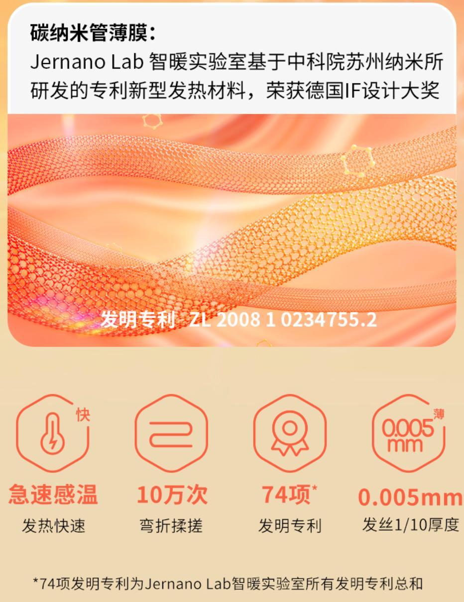 它摒棄了傳統的電阻絲髮熱,而是選用有中科院專利的碳納米管薄膜,發熱均勻得像在曬冬天的太陽,暖洋洋的,讓你享受進被窩秒溫暖的快樂!