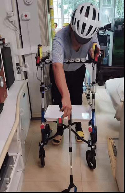兒子小伍記得,自己一次次地在凌晨帶着父親去醫院縫針,最糟糕的一次發生在伍叔剛要從柺杖過渡到助行器的階段。作爲老理工男,他自己用鋁型材DIY了一個柺杖,下面裝了滑輪。在平面推行很順滑,但只能提供垂直支撐。