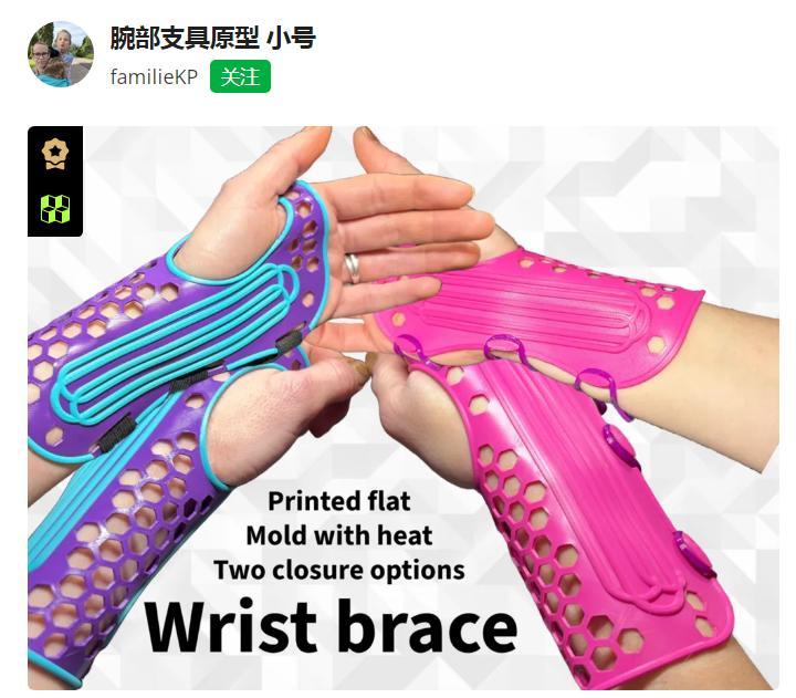 MakerWorld社區之前支持過這樣一個模型:那是一位兩個女兒的母親,爲了患有肌無力的小女兒設計的腕部支具。在那個模型的主頁下,評論區湧入了許多有着相似困境的家庭。更重要的是,因爲模型是開源的,每個人都可以根據自己的尺寸縮放,甚至可以換上喜歡的配色和圖案。那不再是一個帶着病痛標籤的冰冷矯形器,它變成了一個有着草莓圖案或者酷炫配色的、有溫度的禮物。