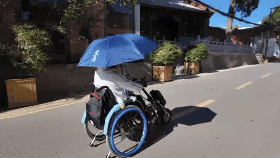 康復機構愛無疆的廖鵬看到段姐時,她正獨自推着輪椅,帶着個大揹包,飛快地過馬路。昆明的陽光照在她臉上,一種風塵僕僕的生命力。