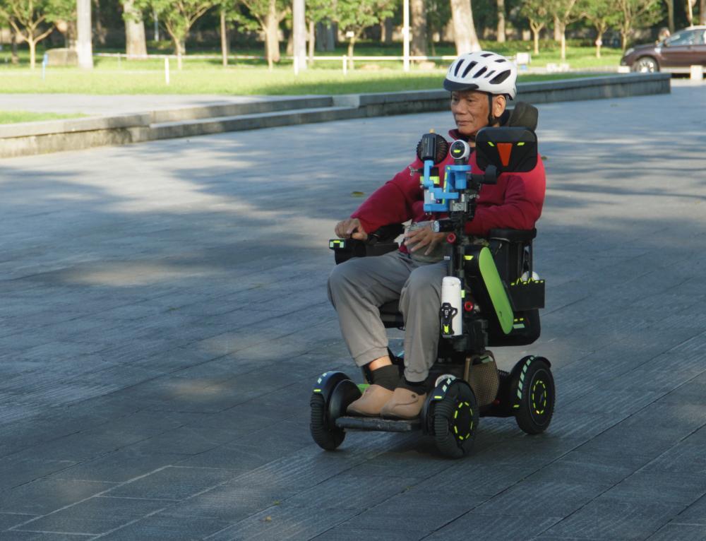 現在的伍叔,出門像開着一輛“重型坦克”。他戴着頭盔,輪椅上掛着風扇、水杯。他在樹蔭下看視頻,聽音樂,還裝了高亮車燈和倒車鏡。他可以獨自在戶外舒適地待上幾個小時,不怕日曬雨淋,沒有口渴蚊叮,回來還會跟兒子說,“今天又有人跟我說,我這個輪椅好酷!”
