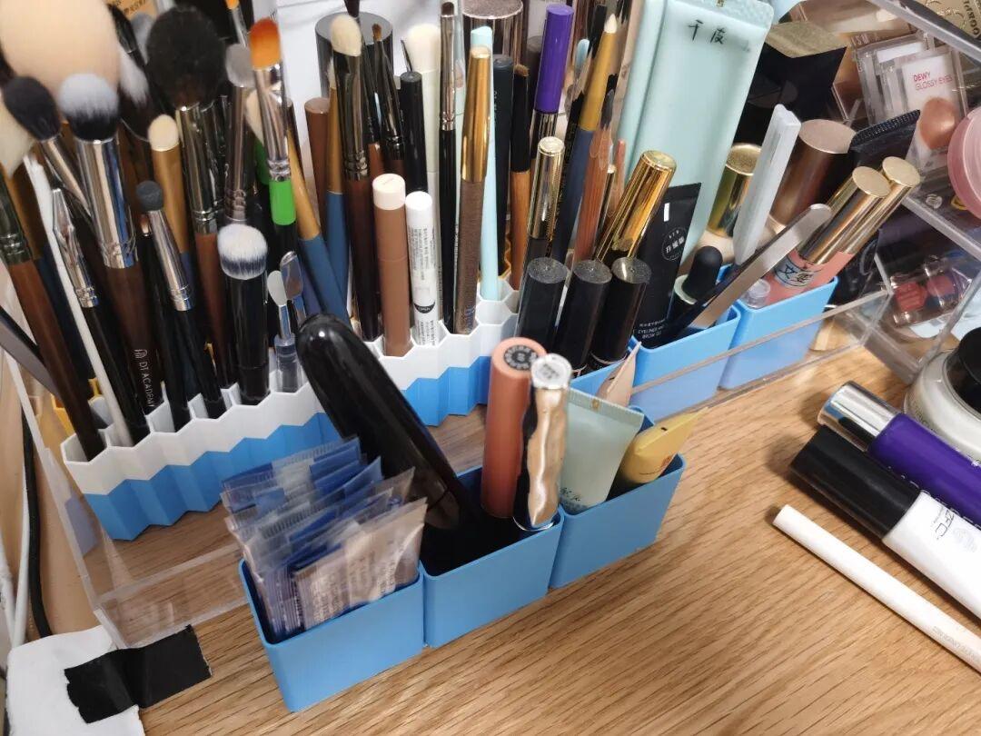 小伍的夫人是化妝師,幾十根眉筆、上百把刷子,塞在行李箱的夾層裏。每次打開箱子,找一支筆像是在尋寶。伍叔用PLA材料打印了一套模塊化的化妝箱。目標很明確:在桌面上佔地面積最小,但能把幾百樣工具全部鋪開。攤開時,所有的眉筆和刷子像士兵一樣羅列,每一支都有專屬的孔洞。小伍形容說:“你想要哪一支,手伸過去,就是哪一支。”