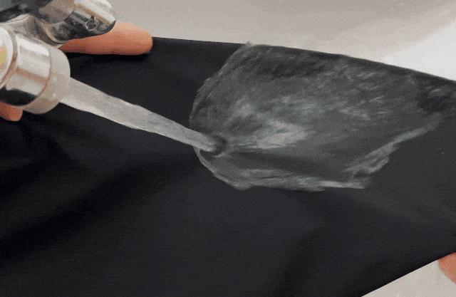 看,我們直接用水直接潑在褲子上面,水珠成串往下滾走,根本無法停留在衣服表面。