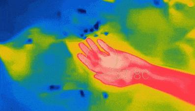 我們再來看看動態的熱成像測試:可以看到褲子蓋上手後,手的體表溫度從原本29℃左右,上升到了37℃左右。