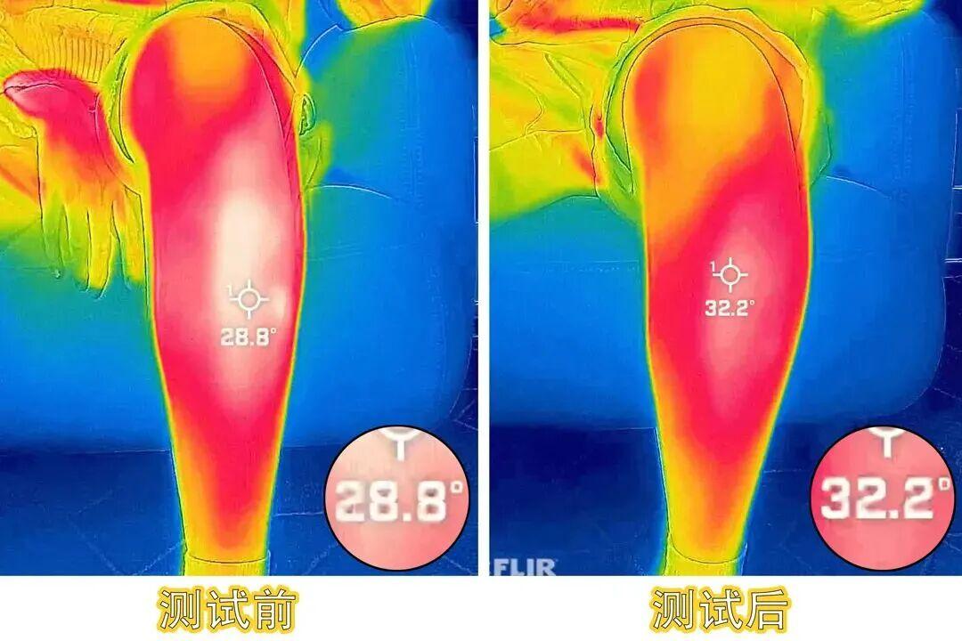 我們來看看動態的熱成像測試:可以看到褲子蓋上手後,手的體表溫度從原本29℃左右,上升到了37℃左右。
