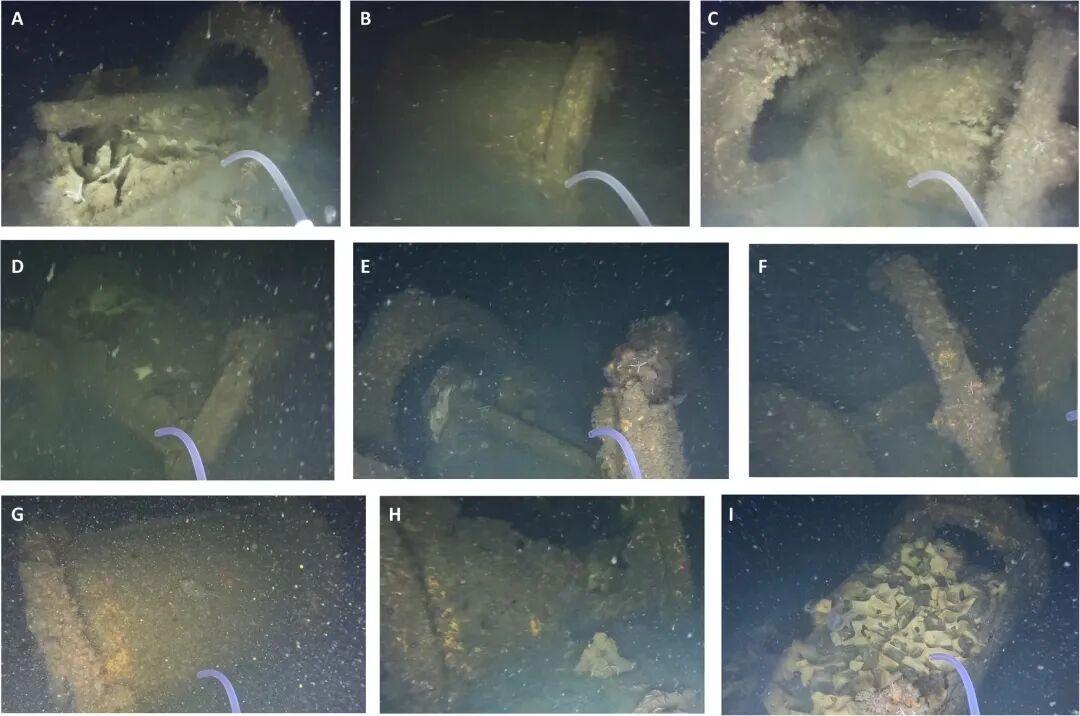 有的彈體完好如初,有的只剩殘骸,有的甚至仍可見黃色的炸藥芯,表面呈現出像奶酪一樣的多孔結構。化學分析顯示,炸彈周圍的水樣中TNT濃度高達2.73mg/L,對於魚類來說幾乎是致死濃度。