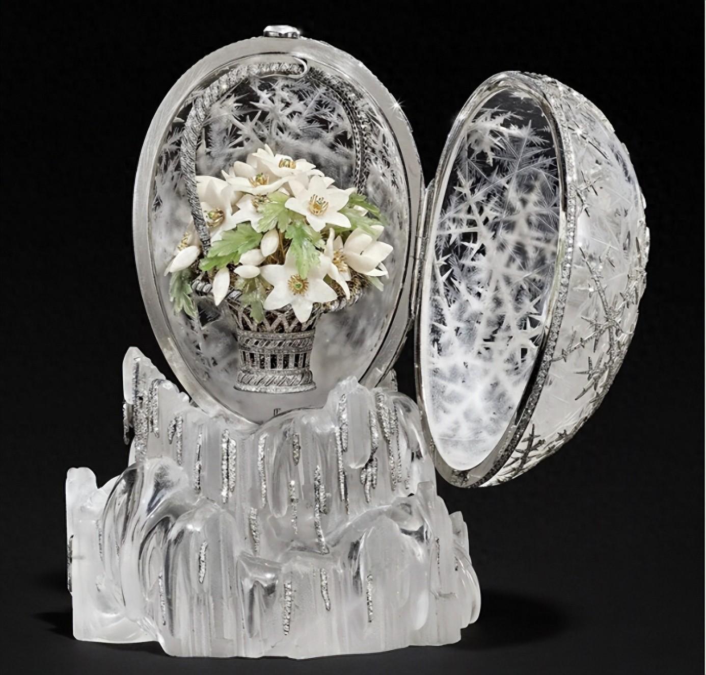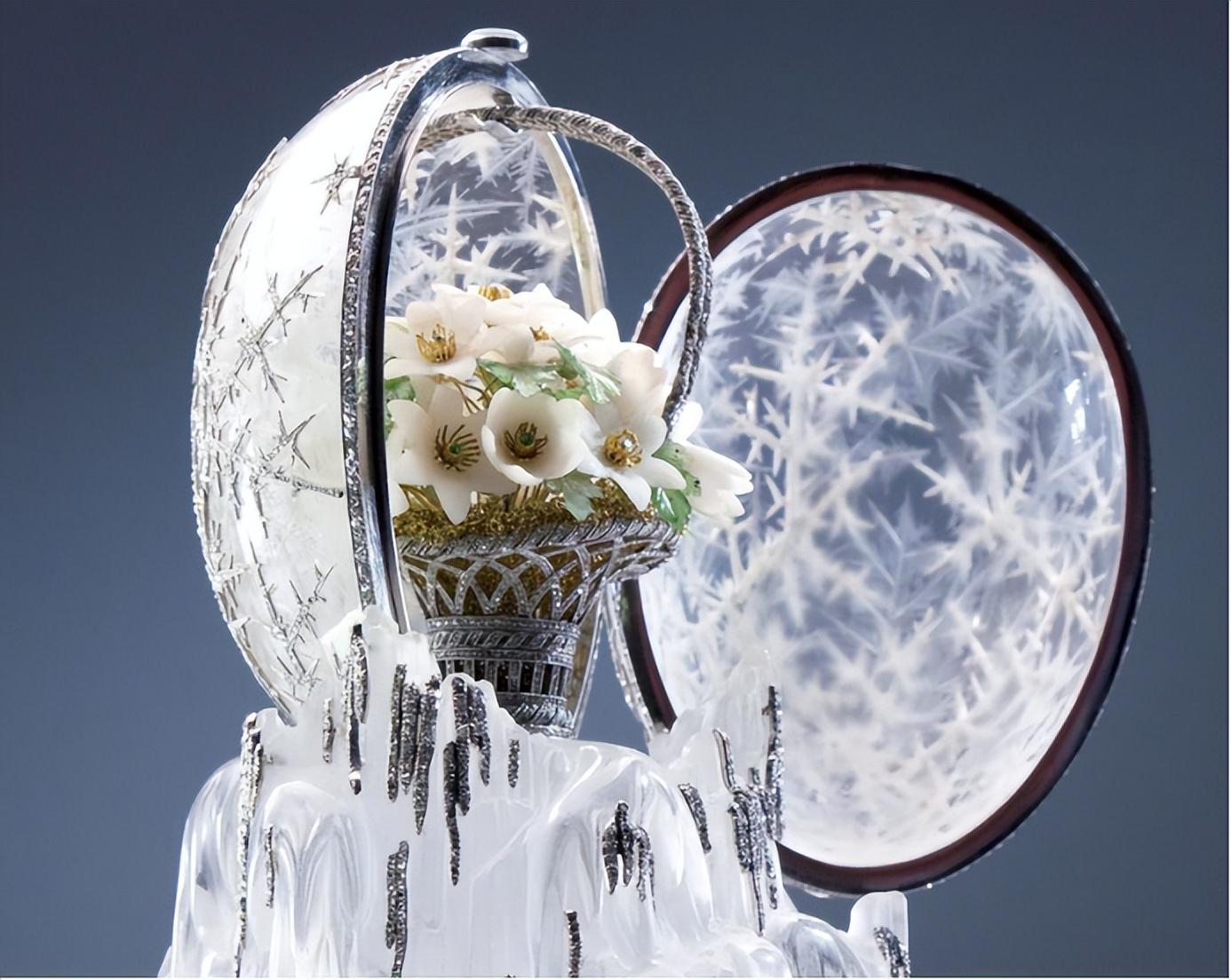 整枚蛋體由透明水晶雕刻,外壁點綴着層層霜紋,再密鋪4500顆玫瑰式切割鑽石與鉑金雪花。底座依舊採用水晶製作,像初春融化的冰塊,表面流淌着鉑金鑲鑽的細流。