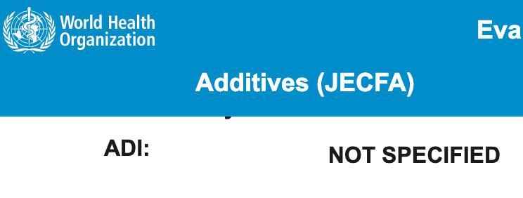 聯合國糧農組織/世界衛生組織食品添加劑聯合專家委員會(JECFA)在對其評估中,給出的結論是其可接受每日攝入量(ADI)“not specified”(未設定限制),意思是在通常使用水平下不會構成毒理學上的安全問題[5]。換言之,按合理食品使用規範攝入,不被認爲有安全顧慮。