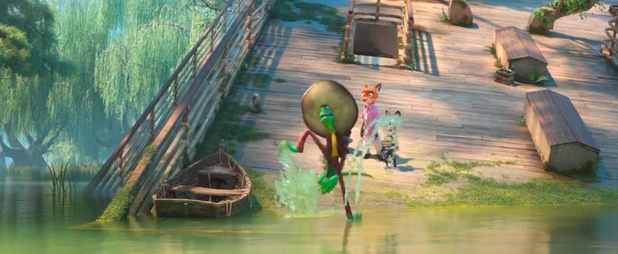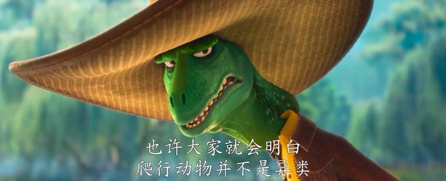 電影開篇先回顧了第一部的內容:綿羊市長想要陷害肉食動物,被朱迪和尼克識破。這裏英文字幕把前情提要的 before 改寫爲 be-fur,中文則選擇了“前情蹄要”。這個翻譯不錯,但還是少了一個微小的呼應。毛髮(fur)是哺乳動物的核心特徵之一,前作裏的動物都是哺乳動物,本作就開始重點關注爬行動物了。