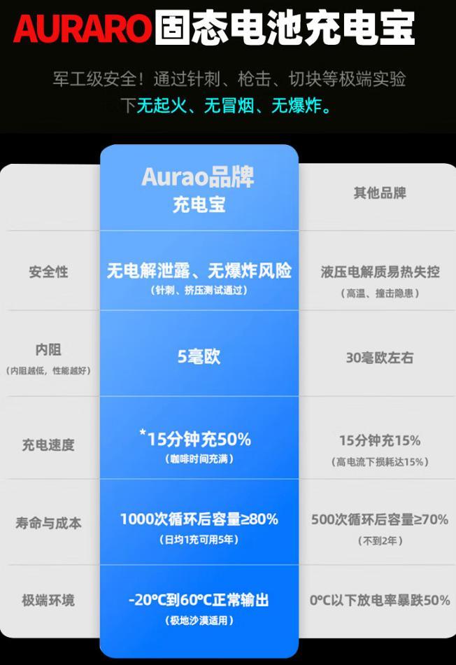 AURARO固態電池充電寶,消除液態電解液熱失控風險,從根源解決安全隱患。不燃燒、不爆炸、不漏液!