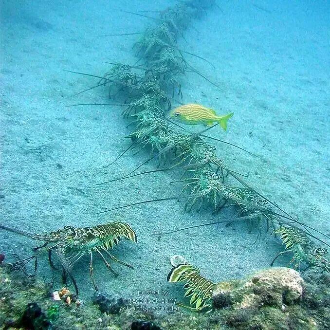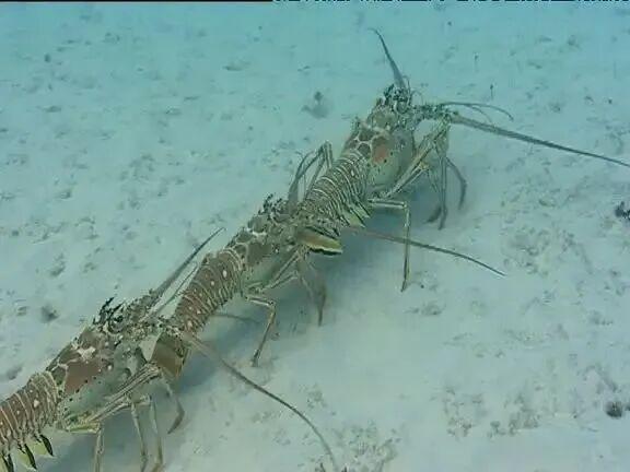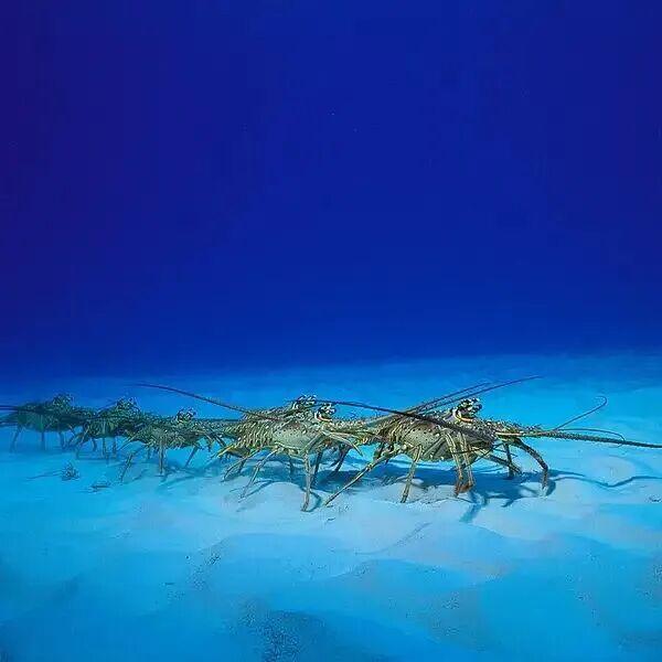 幾十只龍蝦排成一條筆直的隊伍,像訓練有素的士兵一樣,浩浩蕩蕩地穿越海底沙地。