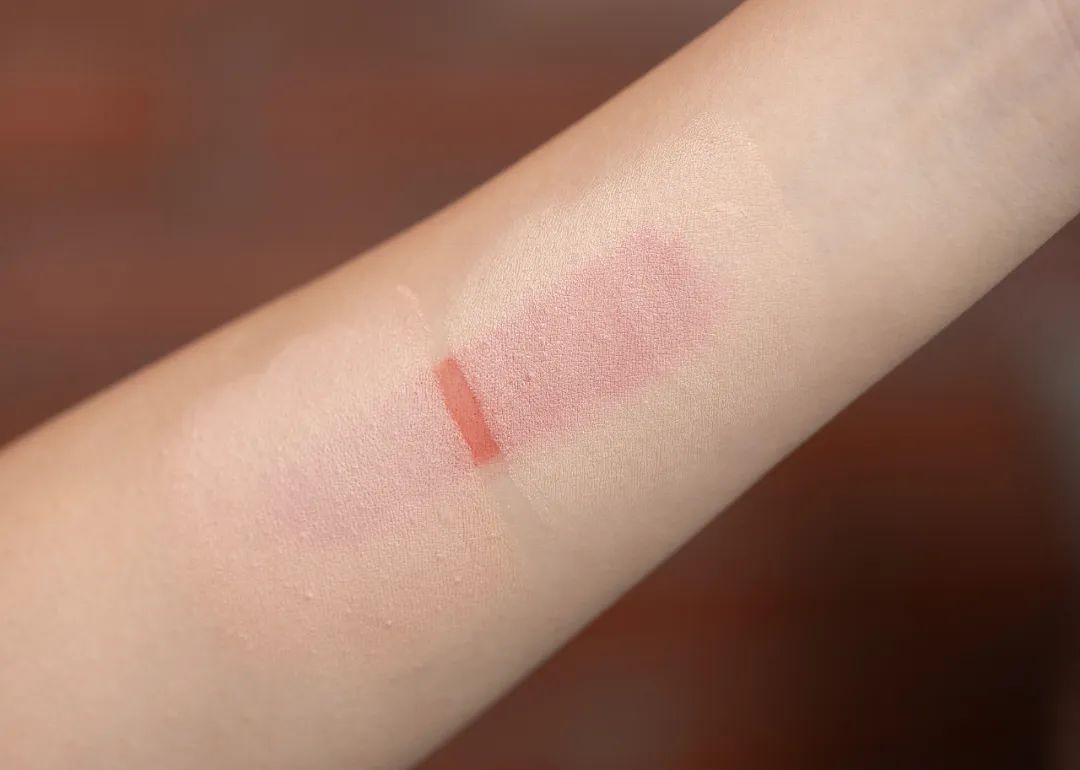 同樣的液體口紅,左邊遮蓋效果大於右邊左邊是美肌,右邊是清透