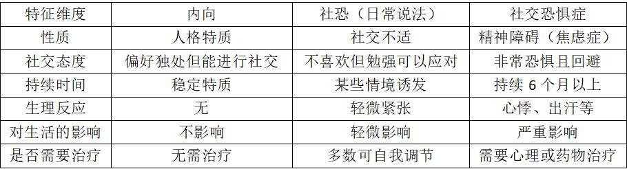那麼,我們該如何分辨自己是內向、“社恐”,還是真的患有社交恐懼症呢?簡單地說: