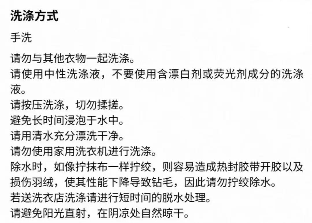 “粘貼式”無縫羽絨服的洗滌方式說明丨電商截圖