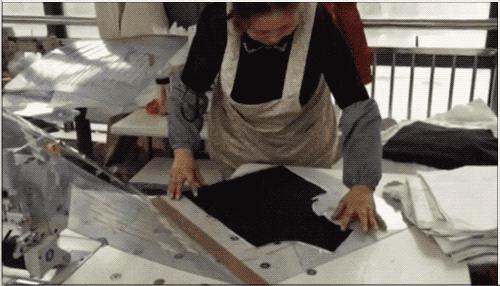 先對齊面料和裏料,蓋上劃好絎縫線的模板再縫紉丨Youtube/Suzhou Qianteng Garments Co., Ltd.