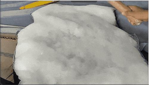 有些羽絨服是先給一大塊布料兜子充絨,再給這塊“羽絨被”做絎縫,最後裁剪成衣服。