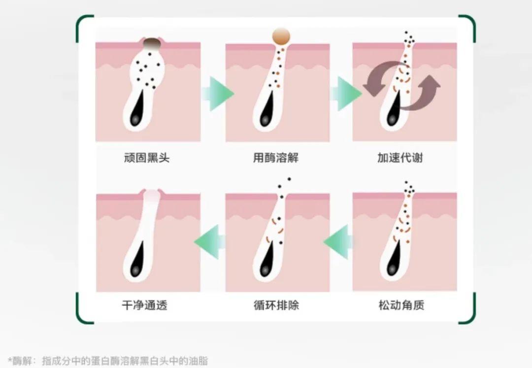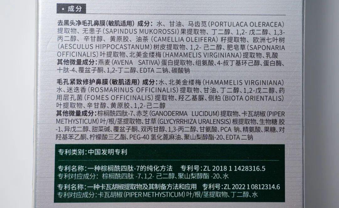 採用了蛋白酶去溶解黑白頭中的油脂,並復配多種植物精萃(油茶籽提取物、歐洲七葉樹樹皮提取物、肥皂草葉提取物、北美金縷梅提取物等),膚感足夠輕柔,“拔黑頭”的力度又足夠大。