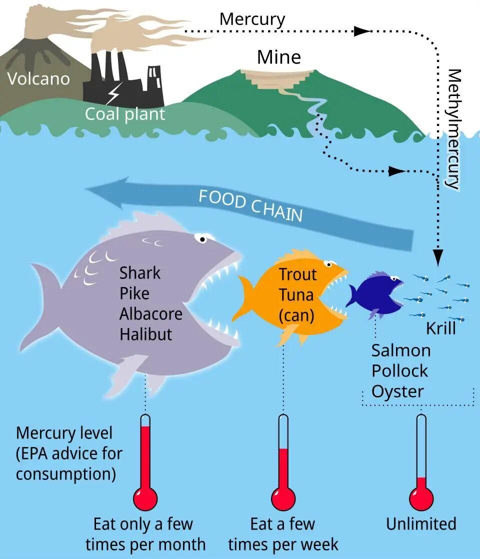 汞污染會被微生物轉化爲甲基汞,並隨着食物鏈逐漸在生物體內富集 | Wikipedia