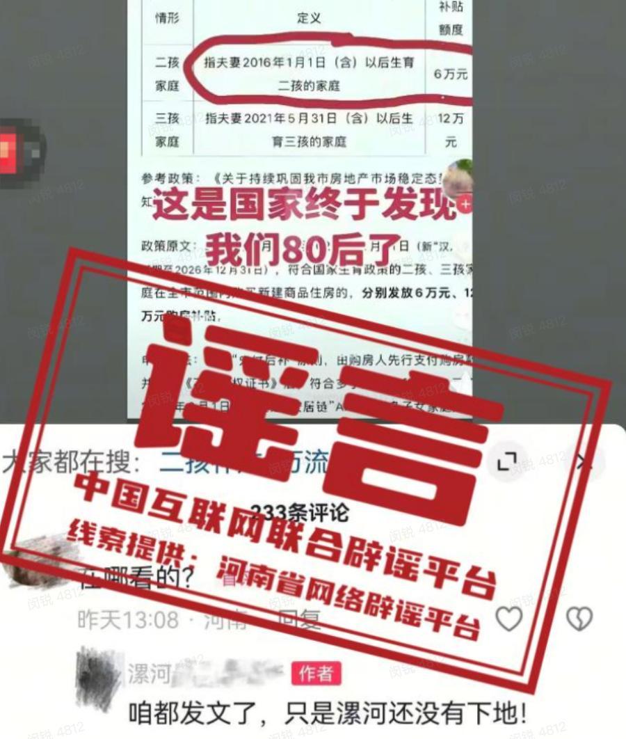 詳情:近日,某網絡平臺流傳“河南漯河二孩三孩家庭享受購房補貼”的信息,引發關注。經當地相關部門查證,該信息系謠言。漯河市目前暫未制定、發佈關於二孩或三孩家庭相關的購房補貼政策,網傳內容屬於對異地政策的“張冠李戴”。