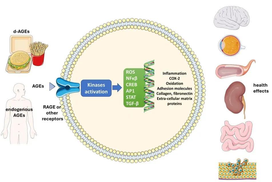 圖 1. AGEs 的作用機制:無論是從膳食中攝入的 AGEs,還是在體內產生的內源性 AGEs,它們都通過與特定受體結合來發揮作用。最終,可能在多個器官和組織(如大腦、眼睛、腎臟、腸道、血管)中觀察到系統性影響,並可能引發糖尿病併發症和/或其他疾病(來自參考資料)
