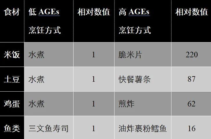 與此同時,應減少高 AGEs 烹飪方法,也就是一些高溫、乾熱的烹飪方式,例如燒烤、煎炸和烘烤。下表就能非常直觀地看出不同烹飪方式的優劣。