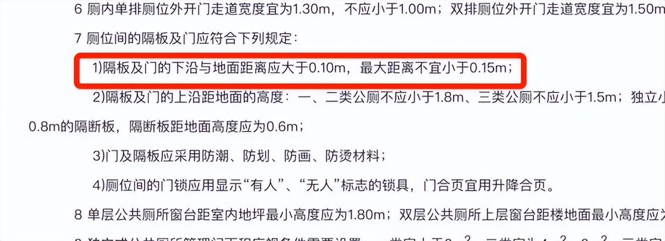 在我們國家的《城市公共廁所設計標準》(CJJ14-2016)裏明確規定,公共廁所的獨立單元間,門板以及隔板下方都需要留出一段空隙,空隙尺寸要大於 10 釐米。