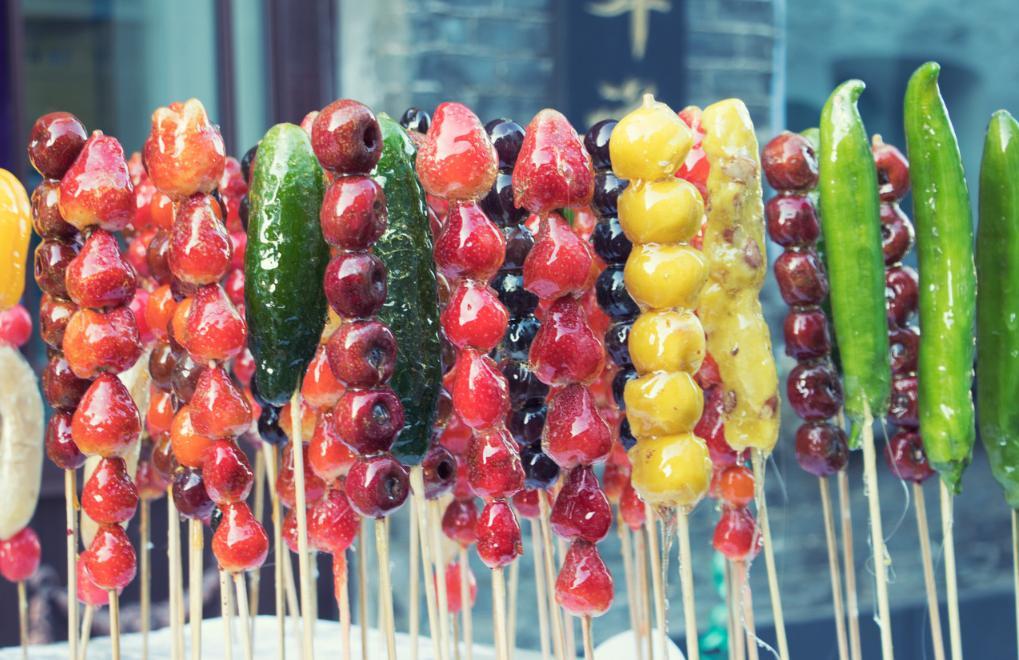 五顏六色的冰糖葫蘆則是街頭的另一抹風景, 不冰的糖葫蘆毫無風情美味減半,咬開凍得嘎嘣脆的糖殼,露出冰涼的山楂果,舌尖先嚐到赤裸的甜,甜裏面裹着酸,酸裏面又透着涼。“冰糖葫蘆兒~五毛錢一串!”,那是小時候最好聽的叫賣聲。如今的東北,儼然想打造一座糖葫蘆“王國”,萬物皆可糖葫蘆。