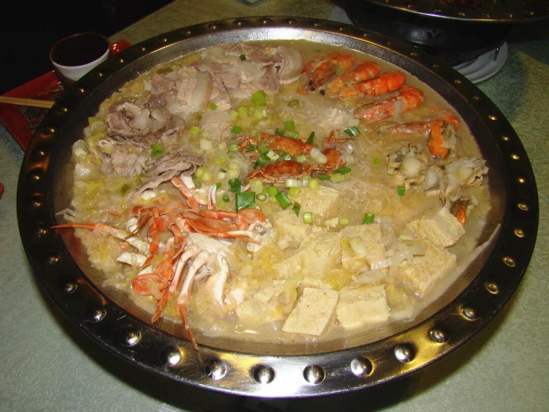 東北的 白肉火鍋,起源於滿族。火鍋以雞湯爲底,選海米、蟹肉、牡蠣和海蟹幾種海鮮來提鮮吊味,煮到八成熟的五花肉切成大薄片,雞脯肉切片裝盤,酸菜絲、白菜和粉絲也上桌,調料則有腐乳汁、韭菜花、蔥薑蒜、香椿末、蝦油、芝麻醬、辣椒油和食鹽等,喫時自行調味,自蘸自食,比普通的酸菜汆白肉多了海味更講究,湯鮮味醇,菜嫩爽口,肉肥不膩。
