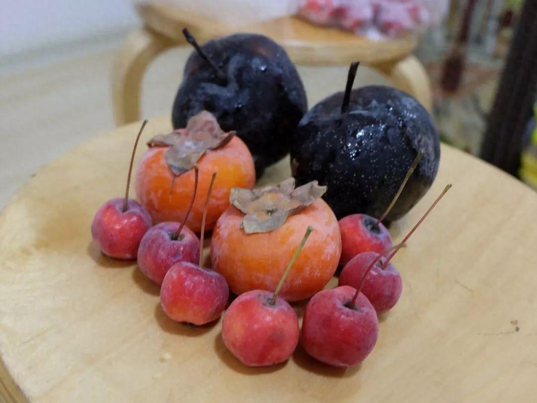 經過低溫冷凍, 花蓋梨、秋子梨化身爲凍梨,磨盤柿子、火柿子化身爲凍柿子,海棠果化身爲凍花紅,嚴寒讓原本酸澀的果子甜度提升幾個檔,變成了外地很難復刻的地域美食,堪稱東北人的私藏寶貝。
