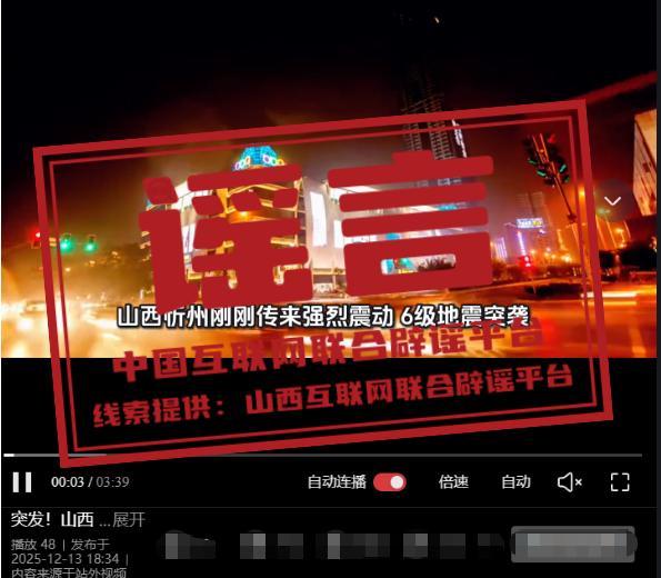 真相:近日,有網民發佈“突發!山西忻州遭遇6級地震,多地震感強烈”等不實信息,引發關注。經中國地震臺網測定,2025年12月13日17點20分,山西省忻州市忻府區發生3.4級地震,震源深度24千米。地震發生後,忻州市、忻府區立即派出工作隊赴震中地區進行實地調查,本次地震未造成人員傷亡和財產損失,社會秩序正常。